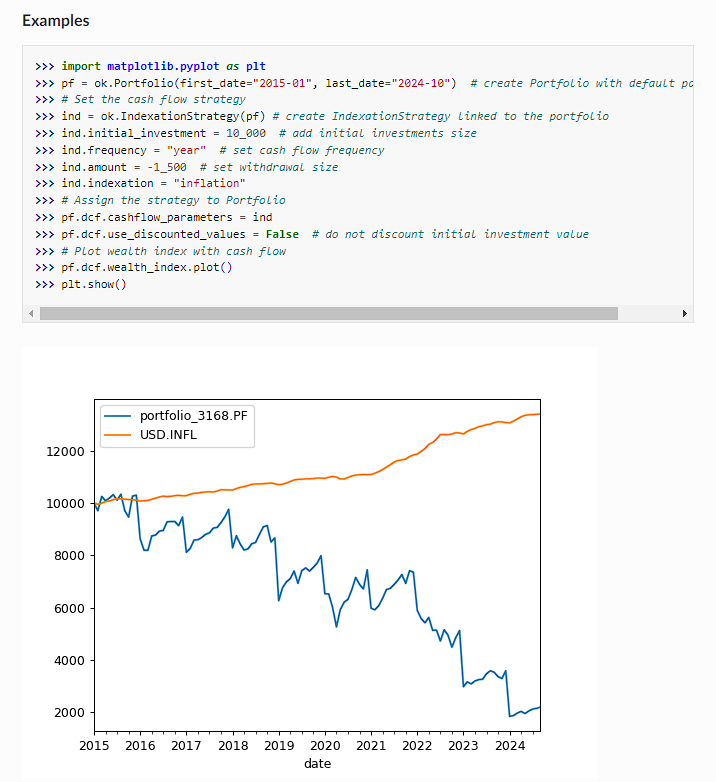 find_the_largest_withdrawals_size- найти наибольший размер снятия средств в рамках стратегии. Для поиска максимального размера снятий используется моделирование Монте-Карло в соответствии со стратегией денежного потока. Этот метод работает сIndexationStrategyиPercentageStrategyinitial_investment_fvиспользуется для расчета будущей стоимости (FV) начальных инвестиций в конце прогнозируемого периодаinitial_investment_pvиспользуется для расчета дисконтированной стоимости (PV) начальных инвестиций на датуfirst_dateиз параметров Portfolio()wealth_index_with_assetsработает как вPortfolio(), но учитывает денежные потоки (вклады и изъятия)- метод